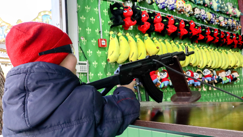 Детям и взрослым предложили пострелять по зеленым чудовищам с красными носами в военной форме. На рукаве у каждого существа нарисовали российский триколор, а на груди — вышивку с буквой Z. Монстры держали в одной руке бутылку, а в другой — пакет из популярной в России сети продуктовых магазинов.