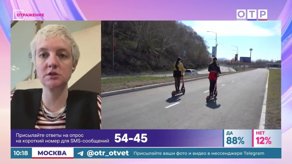 Анастасия Семенова: Ну как раз и телезрители пишут: «У меня был вопрос: как будут бороться?». И вы об этом сказали. По двое, по трое, по четверо даже катаются. Вот из Свердловской области: «Самокат в городе – это опасно». В Екатеринбурге: «Как ездили по два человека на бешеной скорости, так и ездят, никто их не наказывает».